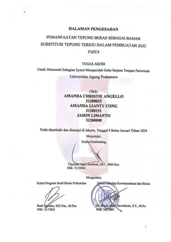 Limanto, Jason (2024) Pemanfaatan Tepung Beras Sebagai Bahan Substitusi Tepung Terigu Dalam Pembuatan Egg Pasta. Diploma thesis, Podomoro University.