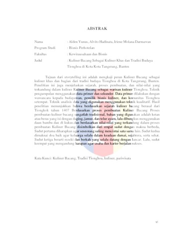 Tujuan dari storytelling ini adalah mengkaji peran Kuliner Bacang sebagai kuliner khas dan bagian dari tradisi budaya Tionghoa di Kota Tangerang, Banten. Penelitian ini juga menjelaskan sejarah, proses pembuatan, dan nilai-nilai yang terkandung dalam kuliner Kuliner Bacang sebagai warisan kuliner Tionghoa. Teknik pengumpulan menggunakan data primer dan sekunder. Data primer dilakukan dengan wawancara kepada budayawan, pemilik bisnis kuliner, dan komunitas Tionghoa setempat. Teknik analisis data yang digunakan menggunakan teknik kualitatif. Hasil penelitian menunjukkan bahwa berdasarkan sejarah kuliner bacang berasal dari Tiongkok tahun 1407 Berdasarkan proses pembuatan Kuliner Bacang Proses pembuatan kuliner bacang sangatlah tradisional, bahan yang digunakan adalah ketan atau beras yang isi dengan daging, jamur, dan telur ayam, lalu dibungkus menggunakan daun bambu dan di kukus.dan berdasarkan nilai-nilai yang terkandung dalam proses pembuatan Kuliner Bacang disimbolkan dari empat sudut dengan makna berbeda, Sudut pertama diharapkan agar seseorang saling mencintai satu sama lain. Sudut kedua dimaknai doa baik agar keluarga selalu dalam keadaan damai, sejahtera, serta sehat. Sudut ketiga berarti rezeki dan berkah yang selalu datang dengan lancar. Lalu, sudut keempat yang mengandung harapan agar usaha dan karier berjalan sukses.