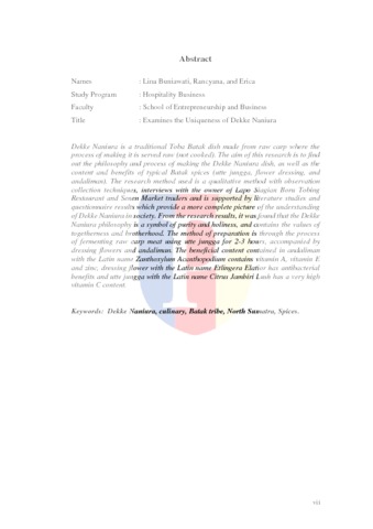 Dekke Naniura merupakan salah satu masakan tradisional khas Batak Toba yang berbahan dasar ikan mas mentah di mana proses pembuatannya disajikan mentah (tidak dimasak). Tujuan penelitian ini dimaksudkan untuk mengetahui filosofi dan proses pembuatan hidangan Dekke Naniura, serta kandungan dan manfaat bumbu khas suku Batak (utte jungga, bunga rias, dan andaliman). Metode penelitian yang digunakan adalah metode kualitatif dengan teknik pengumpulan observasi, wawancara dengan pemilik Restoran Lapo Siagian Boru Tobing dan pedagang Pasar Senen dan didukung dengan kajian literatur dan hasil kuesioner yang memberikan gambaran lebih lengkap mengenai pemahaman Dekke Naniura di masyarakat. Dari hasil penelitian diperoleh filosofi Dekke Naniura sebagai lambang kemurnian dan kesucian, serta mengandung nilai kebersamaan dan persaudaraan. Cara pembuatan melalui proses fermentasi daging ikan mas mentah menggunakan utte jungga selama 2-3 jam dilengkapi dengan bunga rias dan andaliman. Kandungan manfaat yang terkandung dalam andaliman dengan nama latin Zanthoxylum Acanthopodium mempunyai kandungan vitamin A, vitamin E dan zinc, bunga rias dengan nama latin Etlingera Elatior memiliki manfaat sebagai antibakteri dan utte jungga dengan nama latin Citrus Jambiri Lush memiliki kandungan vitamin C yang sangat tinggi.