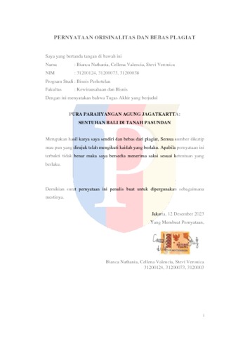 Valencia, Cellena (2024) Pura Parahyangan Agung Jagatkartta: Sentuhan Bali di Tanah Pasundan. Diploma thesis, Podomoro University.