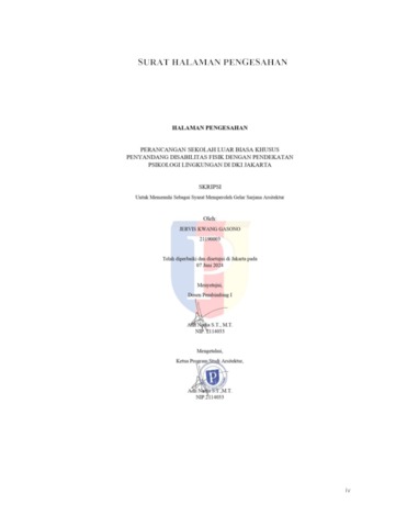 Gasono, Jervis Kwang (2024) Perancangan Sekolah Luar Biasa Khusus Penyandang Disabilitas Fisik Dengan Pendekatan Psikologi Lingkungan di DKI Jakarta. bachelor thesis, Podomoro University.