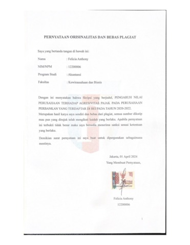 Anthony, Felicia (2024) Pengaruh Nilai Perusahaan Terhadap Agresivitas Pajak pada Perusahaan Perbankan Yang Terdaftar di BEI Tahun 2020-2022. bachelor thesis, Podomoro University.