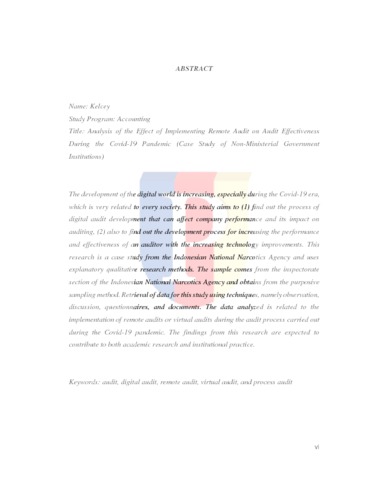 Kelcey, Kelcey (2024) Analisis Pengaruh Penerapan Remote Audit Terhadap Efektivitas Audit pada Masa Pandemi Covid-19 (Studi Kasus Pada Lembaga Pemerintah Non-Kementerian). bachelor thesis, Podomoro University.