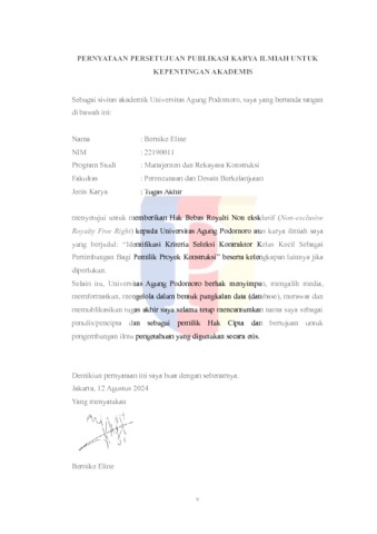 Eline, Bernike (2024) Identifikasi Kriteria Seleksi Kontraktor Kelas Kecil Sebagai Pertimbangan Bagi Pemilik Proyek Konstruksi. Diploma thesis, Podomoro University.