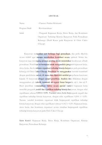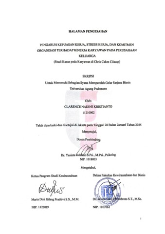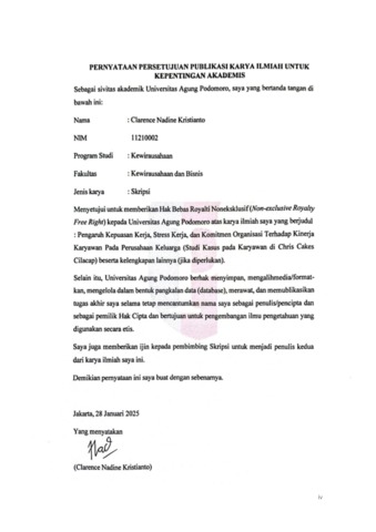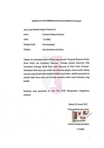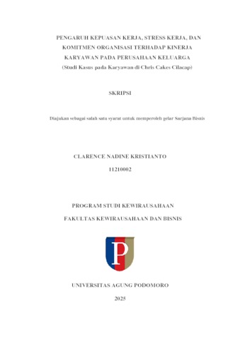 Kristianto, Clarence Nadine (2025) Pengaruh Kepuasan Kerja, Stress Kerja, dan Komitmen Organisasi Terhadap Kinerja Karyawan pada Perusahaan Keluarga (Studi Kasus pada Karyawan di Chris Cakes Cilacap). bachelor thesis, Podomoro University.