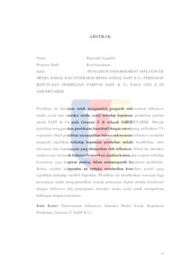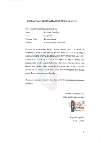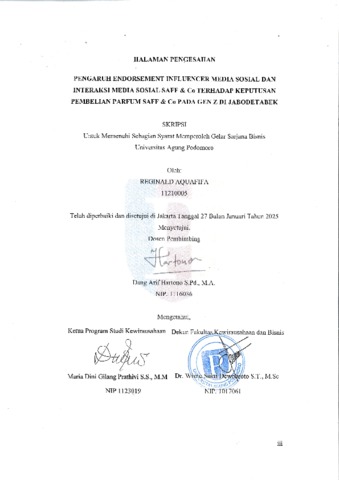 Aquafifa, Reginald (2025) Pengaruh Endorsement Influencer Media Sosial dan Interaksi Media Sosial SAFF & CO Terhadap Keputusan Pembelian Parfum SAFF & CO pada Gen Z di Jabodetabek. bachelor thesis, Podomoro University.