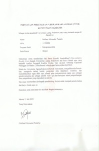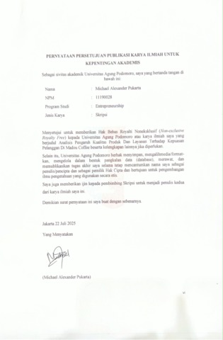 Michael, Alexander Pukarta (2025) Analisis Pengaruh Kualitas Produk dan Layanan Terhadap Kepuasan Pelanggan di Madou Coffee. bachelor thesis, Podomoro University.