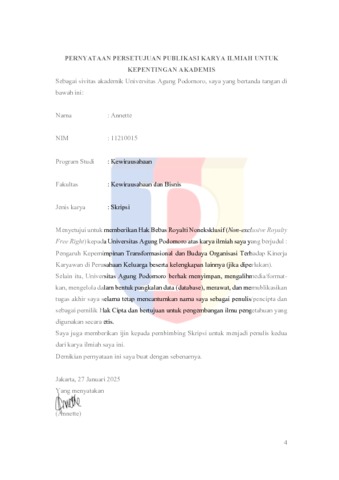 Annette, Annette (2025) Pengaruh Kepemimpinan Transformasional dan Budaya Organisasi Terhadap Kinerja Karyawan di Perusahaan Keluarga. bachelor thesis, Podomoro University.