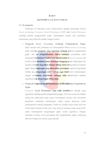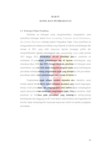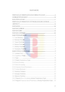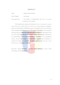 ABSTRAK Nama : Abigail Gracia Pratama Program Studi : Akuntansi Judul Akuntansi : Pengaruh Penerapan Konsep Akuntansi Hijau terhadap Penghindaran Pajak Penelitian ini bertujuan untuk menganalisis pengaruh Akuntansi Hijau, Kinerja Sosial Perusahaan (Corporate Social Performance/CSP), dan Pengungkapan Karbon terhadap penghindaran pajak pada perusahaan. Data dikumpulkan dari laporan keberlanjutan perusahaan yang terdaftar di Bursa Efek Indonesia (BEI) selama periode 2021-2022. Penelitian ini menggunakan metode analisis statistik deskriptif dan analisis statistik inferensial sebagai alat analisis data untuk menguji hubungan antar variabel yang diteliti. Penelitian ini memberikan kontribusi untuk pemahaman faktor-faktor yang mempengaruhi penghindaran pajak dalam konteks keberlanjutan, dan memberikan wawasan bagi praktisi, regulator, dan peneliti untuk mempertimbangkan dampak praktik akuntansi berkelanjutan dan Kinerja Sosial Perusahaan terhadap perilaku pajak perusahaan.
