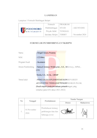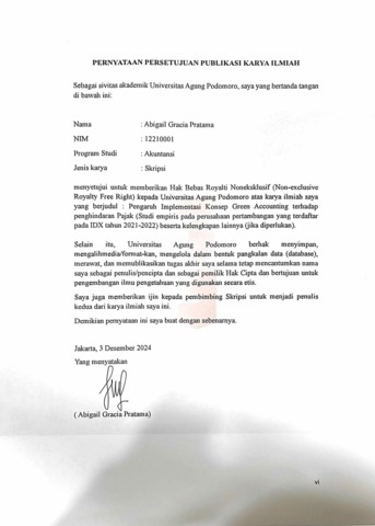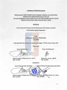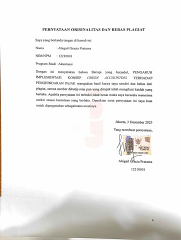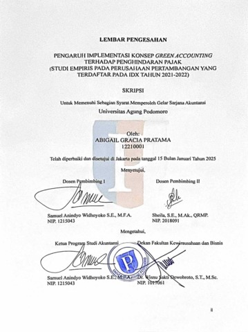 Pratama, Abigail Gracia (2025) Pengaruh Implementasi Konsep Green Accounting Terhadap Penghindaran Pajak (Studi Empiris pada Perusahaan Pertambangan yang Terdaftar di IDX Tahun 2021-2022). bachelor thesis, Podomoro University.
