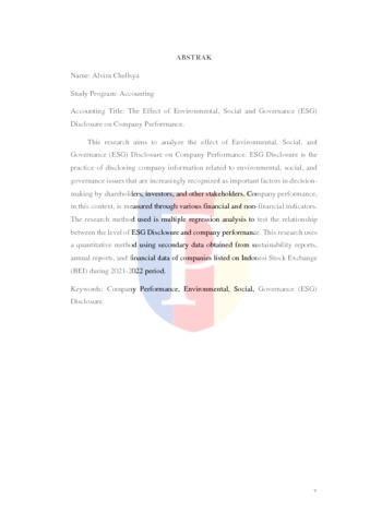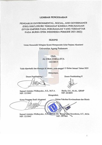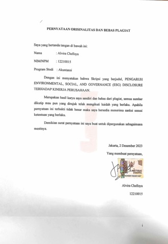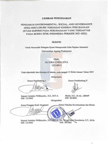Chellsya, Alvira (2025) Pengaruh Environmental, Social, and Governance (ESG) Disclosure Terhadap Kinerja Perusahaan (Studi Empiris pada Perusahaan yang Terdaftar pada Bursa Efek Indonesia Tahun 2021-2022). bachelor thesis, Podomoro University.