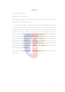Penelitian ini bertujuan untuk menganalisis pengaruh Environmental, Social, and Governance (ESG) Disclosure terhadap Kinerja Perusahaan. Pengungkapan ESG adalah praktik pengungkapan informasi perusahaan terkait isu lingkungan, sosial, dan tata kelola yang semakin diakui sebagai faktor penting dalam pengambilan keputusan oleh pemegang saham, investor, dan pemangku kepentingan lainnya. Kinerja perusahaan dalam konteks ini diukur melalui berbagai indikator finansial dan non finansial. Metode penelitian yang digunakan adalah analisis regresi berganda untuk menguji hubungan tingkat Pengungkapan ESG dengan kinerja perusahaan. Penelitian ini menggunakan metode kuantitatif dengan menggunakan data sekunder yang diperoleh dari laporan keberlanjutan, laporan tahunan, dan data keuangan perusahaan yang terdaftar di Bursa Efek Indonesia (BEI) selama periode 2021-2022.