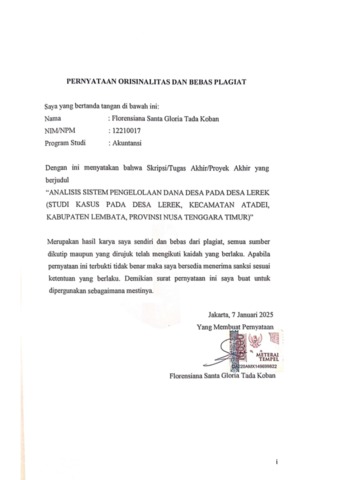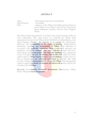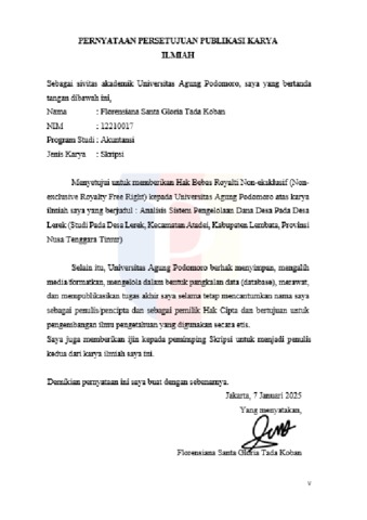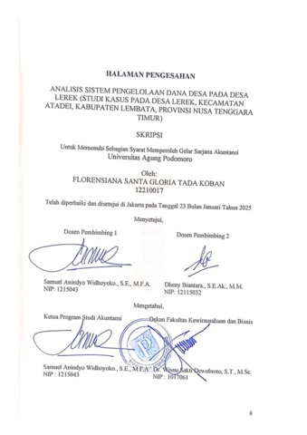 Koban, Florensiana Santa Gloria Tada (2025) Analisis Sistem Pengelolaan Dana Desa pada Desa Lerek (Studi Kasus pada Desa Lerek, Kecamatan Atadei, Kabupaten Lembata, Provinsi Nusa Tenggara Timur). bachelor thesis, Podomoro University.