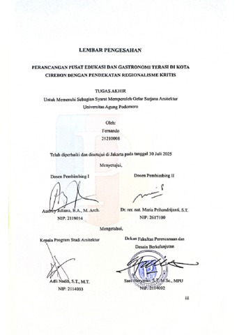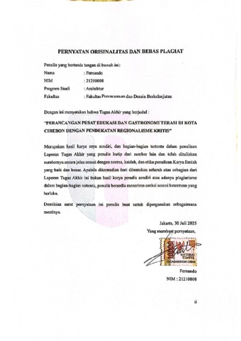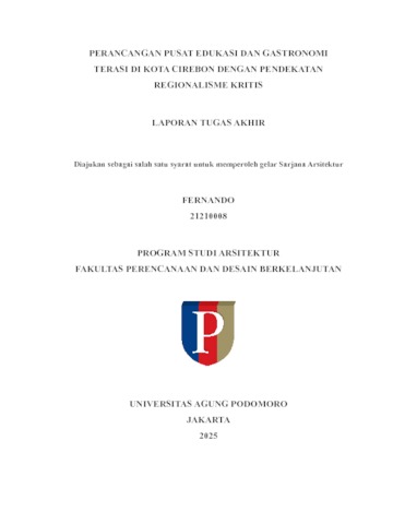 Fernando, Fernando (2025) Perancangan Pusat Edukasi dan Gastronomi Terasi di Kota Cirebon dengan Pendekatan Regionalisme Kritis. bachelor thesis, Podomoro University.