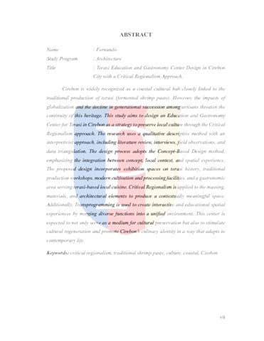 Cirebon secara luas dikenal sebagai pusat budaya pesisir yang memiliki keterkaitan erat dengan produksi terasi tradisional (fermentasi udang rebon). Namun, dampak globalisasi dan menurunnya regenerasi antar generasi perajin mengancam keberlanjutan warisan ini. Penelitian ini bertujuan untuk merancang Pusat Edukasi dan Gastronomi Terasi di Cirebon sebagai strategi pelestarian budaya lokal melalui pendekatan Regionalisme Kritis. Penelitian ini menggunakan metode deskriptif kualitatif dengan pendekatan interpretatif, mencakup studi pustaka, wawancara, observasi lapangan, dan triangulasi data. Proses perancangan mengadopsi metode Concept-Based Design yang menekankan integrasi antara konsep, konteks lokal, dan pengalaman ruang. Desain yang diusulkan mencakup ruang pameran tentang sejarah terasi, workshop produksi tradisional, fasilitas budidaya dan pengolahan modern, serta area gastronomi yang menyajikan kuliner lokal berbasis terasi. Pendekatan Regionalisme Kritis diterapkan pada massa bangunan, material, dan elemen arsitektur untuk menghasilkan ruang yang bermakna secara kontekstual. Selain itu, Transprogramming digunakan untuk menciptakan pengalaman ruang yang interaktif dan edukatif melalui penggabungan berbagai fungsi dalam satu lingkungan terpadu. Pusat ini diharapkan tidak hanya menjadi media pelestarian budaya, tetapi juga mendorong regenerasi budaya serta mempromosikan identitas kuliner Cirebon secara adaptif terhadap kehidupan kontemporer.
