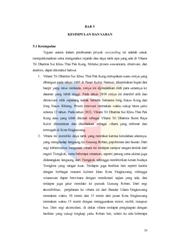 Kota Singkawang dijuluki sebagai ‘Kota Seribu Kelenteng’ karena banyaknya bangunan vihara dan kelenteng disana. Salah satu yang terbesar dan termegah adalah Vihara Tri Dharma Sui Kheu Thai Pak Kung. Vihara ini awalnya merupakan cetiya kecil yang berpindah lokasi dari pasar kulor ke area Gunung Roban, lalu direnovasi dan diresmikan pada tanggal 4 Oktober 2022. Renovasi tersebut menjadikan vihara ini memiliki infrastruktur yang indah khas Tiongkok. Dikelilingi oleh pegunungan, vihara ini menawarkan pemandangan alam yang mempesona, dilengkapi dengan kantin yang menjual makanan khas Singkawang, lalu fasilitas listrik dan air. Akses ke vihara ini dapat dijangkau menggunakan motor, mobil, maupun bus karena jalanan yang sudah menggunakan aspal serta lahan parkir yang luas. Terdapat beberapa penginapan dari yang biasa hingga berbintang di dekat vihara maupun pusat kota sebagai opsi penginapan wisatawan. Kota Singkawang juga sudah dilengkapi banyak minimarket, bank, dan juga beberapa rumah sakit dengan fasilitas yang memadai. Tugas akhir ini bertujuan untuk mendorong pengembangan wisata religi di Kota Singkawang melalui Vihara Tri Dharma Sui Kheu Thai Pak Kung. Pengumpulan data tugas akhir ini dilakukan melalui metode triangulasi sumber data yaitu observasi objek, penelitian literatur, dan wawancara dengan beberapa narasumber. Terdapat 3 sumber informan yang disorot di dalam storytelling ini yaitu pengurus Tri Dharma, pelaku bisnis di kantin vihara, serta wisatawan. Disarankan bagi pihak-pihak pemangku kepentingan untuk memperhatikan dan membantu mengembangkan objek yang berpotensi mendorong wisata di kota Singkawang terutama wisata religinya.