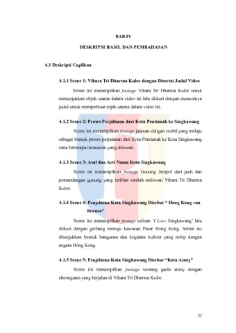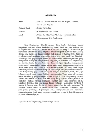 Kota Singkawang dijuluki sebagai ‘Kota Seribu Kelenteng’ karena banyaknya bangunan vihara dan kelenteng disana. Salah satu yang terbesar dan termegah adalah Vihara Tri Dharma Sui Kheu Thai Pak Kung. Vihara ini awalnya merupakan cetiya kecil yang berpindah lokasi dari pasar kulor ke area Gunung Roban, lalu direnovasi dan diresmikan pada tanggal 4 Oktober 2022. Renovasi tersebut menjadikan vihara ini memiliki infrastruktur yang indah khas Tiongkok. Dikelilingi oleh pegunungan, vihara ini menawarkan pemandangan alam yang mempesona, dilengkapi dengan kantin yang menjual makanan khas Singkawang, lalu fasilitas listrik dan air. Akses ke vihara ini dapat dijangkau menggunakan motor, mobil, maupun bus karena jalanan yang sudah menggunakan aspal serta lahan parkir yang luas. Terdapat beberapa penginapan dari yang biasa hingga berbintang di dekat vihara maupun pusat kota sebagai opsi penginapan wisatawan. Kota Singkawang juga sudah dilengkapi banyak minimarket, bank, dan juga beberapa rumah sakit dengan fasilitas yang memadai. Tugas akhir ini bertujuan untuk mendorong pengembangan wisata religi di Kota Singkawang melalui Vihara Tri Dharma Sui Kheu Thai Pak Kung. Pengumpulan data tugas akhir ini dilakukan melalui metode triangulasi sumber data yaitu observasi objek, penelitian literatur, dan wawancara dengan beberapa narasumber. Terdapat 3 sumber informan yang disorot di dalam storytelling ini yaitu pengurus Tri Dharma, pelaku bisnis di kantin vihara, serta wisatawan. Disarankan bagi pihak-pihak pemangku kepentingan untuk memperhatikan dan membantu mengembangkan objek yang berpotensi mendorong wisata di kota Singkawang terutama wisata religinya.