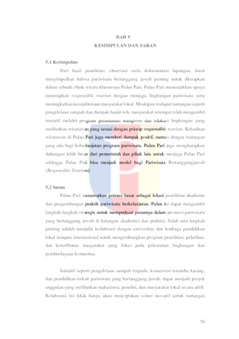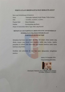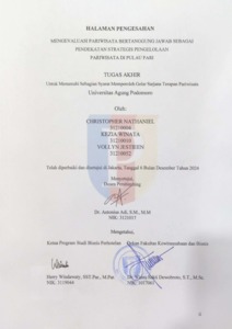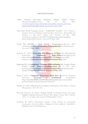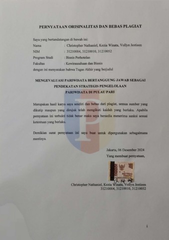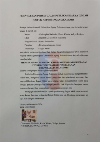 Winata, Kezia (2025) Mengevaluasi Pariwisata Bertanggung Jawab Sebagai Pendekatan Strategis Pengelolaan Pariwisata di Pulau Pari. Diploma thesis, Podomoro University.