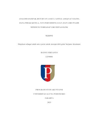 Firyanto, Hanny (2023) Analisis Dampak Pengembalian Aset, Rasio Kecukupan Modal, Dana Pihak Ketiga, Pinjaman Bermasalah, dan Giro Wajib Minimum terhadap Likuiditas Bank. bachelor thesis, Podomoro University.